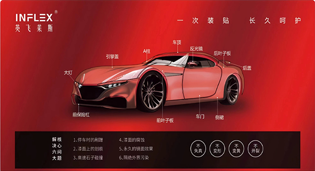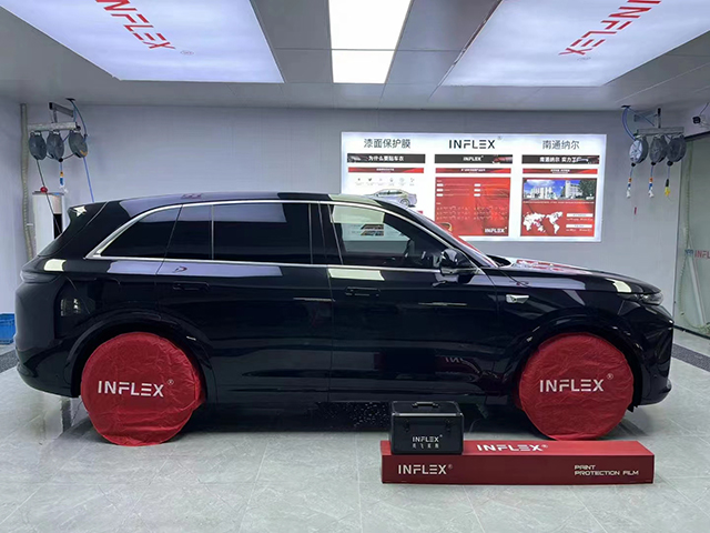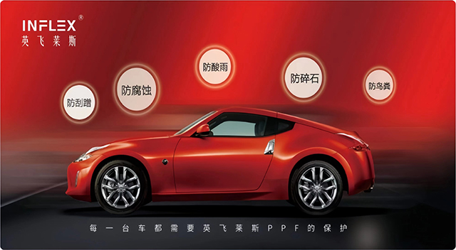 安装INFLEX 漆面保护膜了 2 小时内不能用力过大的擦洗保护膜的边缘,禁止使用高压水枪直接冲洗保护膜的边缘。可以使用细研磨料、不含强弱溶剂且非强酸强碱的清洁剂擦拭,清除膜面上的残留虫渍。已安装 INFLEX 漆面保护膜的车辆若作婚车使用,请不要将吸盘直接粘在膜面;婚车彩带、烟花爆竹易造成膜面染色,遇到雨雪天气时,防止雨水长时间浸透以防渗透染色。为了保持膜面的光亮如新,请按期回授权施工中心进行专业养护,建议养护周期为每年四次。